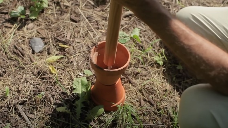 Gardener Suburban Homestead shows how to make the hose guard in his YouTube post. Take two 4-inch ceramic flower pots with large drainage holes and a 12-inch galvanized steel pole. Place one pot upside down on the soil in your flower bed or the edge of your lawn, and the other pot right-side up on top of that. Then, use a rubber mallet to hammer the pole through the drainage holes into the soil, and that's it.