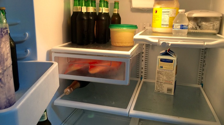 When something spills inside the fridge, it can be tempting to just shut the door and deal with it later. However, letting these spills linger in your fridge can lead to stubborn stains and odors. Instead, you should address accidents right away to prevent them from becoming harder to clean. This is because the longer something sits, the longer it has to seep into the pores of the refrigerator's surfaces. Immediate action is also a good idea to prevent things from getting too stinky, as these incidents often harbor bacteria. This will cause unpleasant smells and potentially contaminate other foods, too.