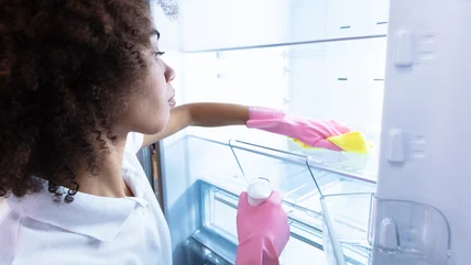 Take equal parts of peroxide and water and pour them into a spray bottle. Remove everything from your fridge, unplug it, then spray down the shelves and walls with this mixture. Then, you only need to let it sit for a minute or two before wiping everything out with a microfiber cloth. Not only does this help to remove smells, but it loosens up anything that may be stuck to the inside of your fridge. You can repeat this a few times to get rid of tough messes. Once you're happy with how it looks and smells, you can put everything back in its place.