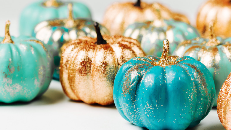 Autumn is pumpkin season, with this plump variety of winter squash bedecking haystacks, front porches, and interior decorations everywhere. The most common form is the spooky jack-o-lantern, whose hollowed-out and sometimes horrific visage is one of the most popular decorating ideas for using pumpkins. While carved pumpkins can be a great way to greet trick-or-treaters on Halloween night, there are just as many great pumpkin ideas for decorating that don't involve chopping up your pumpkin. Many involve materials like paint, decorative doo-dads, rhinestone accessories, glitter, and other materials instead.