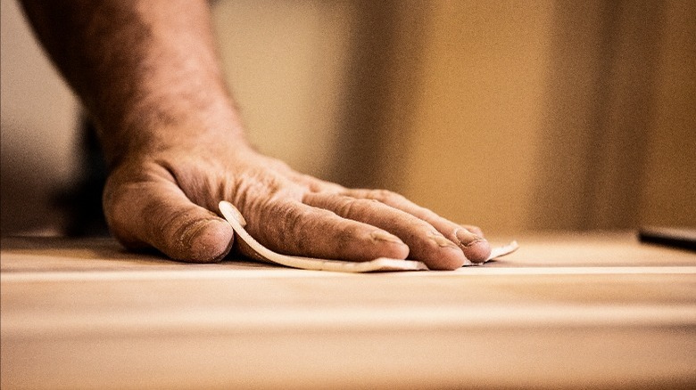 Begin by sanding the surface of bare wood with 120 to 150-grit sanding paper to ensure that the oil penetrates. If you're working on a large area, you may use a disc or drum sander. If the wood has been previously oiled, you don't have to sand it. You shouldn't use linseed oil on wood with wax, varnish, or paint finishes, as these would prevent oil penetration. After sanding, dust and vacuum the surface to remove any excess sawdust. You can also clean the surface with a rug with mineral spirits to remove grime, scuffs, and remaining paint from the wood surface, then use a clean cloth to dry the newly cleaned surface completely.