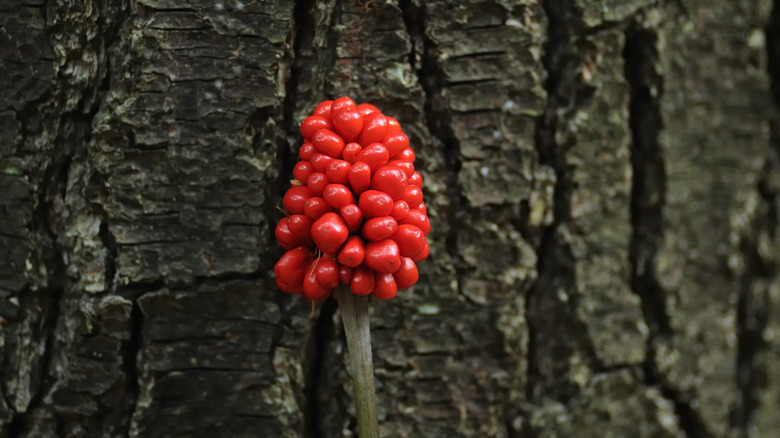 Most herbivorous insects leave Jack-in-the-pulpit well alone, perhaps due to the skin and tongue-tingling calcium oxalate crystals every part of the plant contains in abundance. Humans are highly discouraged from eating any part of Jack-in-the-pulpit raw as it can cause significant swelling, blisters, and burning in the mouth and throat, per Mount Sinai. Deer and bears feast on the plants when other options have been exhausted while birds nibble the bright-red-when-ripe berries that appear in late summer.