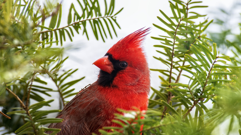 You can make your life easier by choosing native varieties that don't drop much debris on the ground. If you hate raking leaves, evergreens are an excellent option, especially since cardinals stay put in the winter and may enjoy the extra cover. Keep in mind that you don't have to go big. You need not plant trees that may interfere with overhead power lines. Shrubs and vines work better for attracting cardinals who tend to hang out closer to the ground than many other birds.