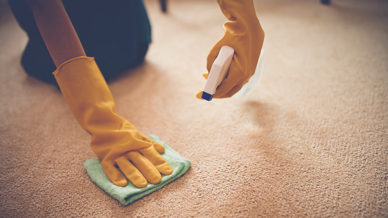 If you want to add fragrance to the soiled area, you may want to consider a recipe shared on TikTok. TikToker @renoswithinreach, known for her helpful tips for homeowners, uses Tide powder detergent, vinegar, water, and baking soda with hydrogen peroxide. Mix an equal amount of water and vinegar and pour it on the problem area before sprinkling a generous amount of baking soda. Then mix ¼ cup of hydrogen peroxide with 1 teaspoon of Tide powder and pour the solution on the area. While wearing a rubber glove, massage the ingredients onto the area and dab with a towel after 15 minutes. When dry, run a vacuum over the area.