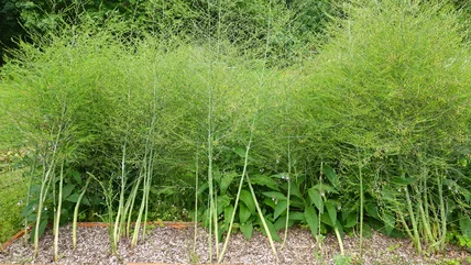 Higher carbon storage and nutrients in the crown and roots lead to more leafing, so keep asparagus ferns working as long as they can before pruning. If you cut the plant back early, be prepared for a poor harvest. Simply put, let frost destroy the foliage before clearing it out. However, you can make an exception for pest-infested fronds, since the feeders will offset all production gains. Further, if you're using female asparagus plants that set characteristic red pods, remove the seeds. If you don't, the plant will begin self-propagating, which will shrink food stocks.