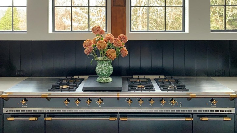 Forgo the tedious task of tiling your kitchen backsplash and try a bit of black-painted trim instead. It's sleek and will look lovely with almost any appliance color, such as stainless steel, black, or brass. It can also work with a more rustic or contemporary kitchen. Think of how the black backdrop will help highlight the colors of everyday objects, like the flower vase seen here or even a bowl of fresh produce. Plus, it won't show off all the grease stains and food spills around the stove and sink.