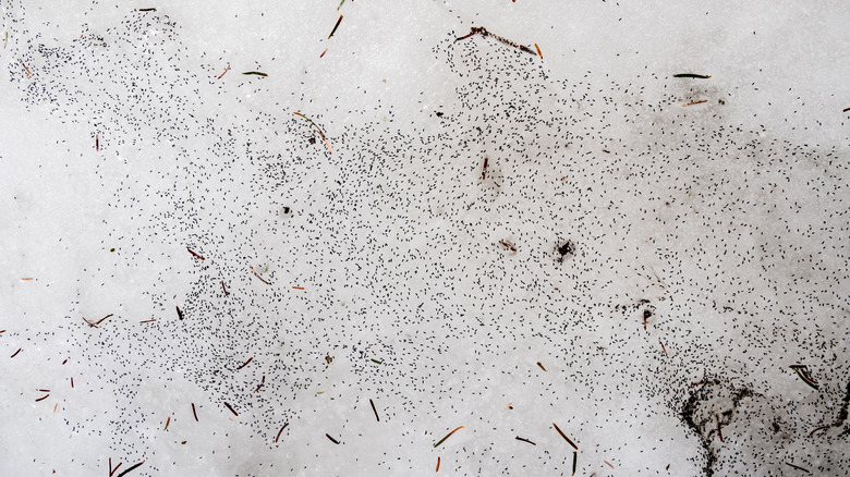 There's nothing more exciting in winter than romping around in the snow. As your kids build forts and make snow angels, or you shovel the driveway, you may notice the snow under your feet begin to turn black. What you're likely seeing are tiny hexapods called snow fleas (Hypogastrura nivicola). Snow fleas are not traditional fleas like you'd see on a dog or cat, but rather small-scale creatures from the arthropod family. Although snow fleas can jump, they do not bite and pose no danger to humans or family pets.