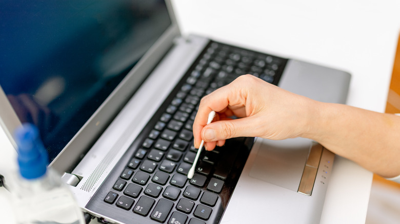 Enter the humble Q-tip. To clean your keyboard more thoroughly, make sure the computer is off and then blow off any crumbs or dust with a product like Falcon Dust-Off from Staples. Give the keys a quick wipe down with a cloth dampened in rubbing alcohol or a product designed to clean keyboards like Techspray from Amazon. Then wet a Q-tip with your chosen cleaner and run it between the keys for a deep clean. While you're at it you can also clean the hinges of your laptop and the screen area around the bevel where dirt collects.