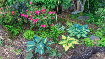 Soil is important for both these shade-loving plants. To successfully care for your hostas and azaleas, both will need rich, well-drained, organic soil that is slightly acidic. Adding soil amendments such as compost, peat moss, coffee grounds, and pine needles is good for these plants. A natural shredded pine bark mulch around these plantings will break down naturally into the soil over time, providing good nutrients, as well as helping to protect roots, retain moisture, and prevent weeds.