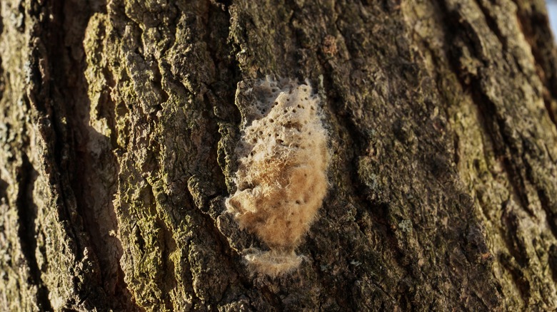 You might also see fuzzy beige or tan-colored clumps that are typically found on trunks, branches, or under bark. These sacs contain scores of gypsy moth eggs. If you remove them at this stage, you can save your oak from as many as 1,000 hatched gypsy moth caterpillars from each fuzzy mass. You can find lone sacs attached to a tree, although they can be found in large clusters, too, which can encapsulate thousands of eggs, all ready to hatch together.
