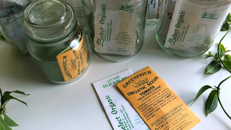 Grab your packet of seeds. It can be helpful to put the seeds in a plate or shallow bowl so you can grab them easier, rather than shaking them directly out of the seed packet.