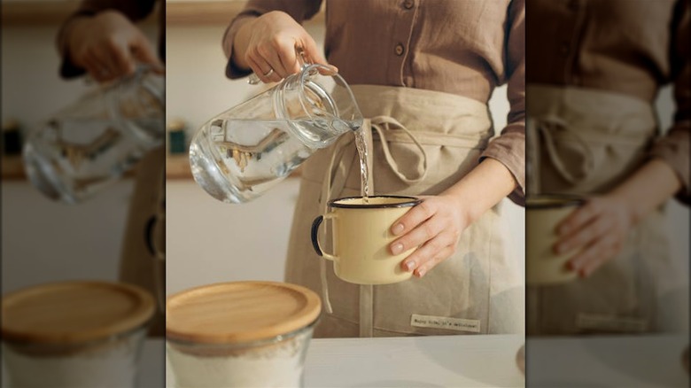 Because the tape will be going in the ground, you'll want to use a non-toxic, biodegradable adhesive to attach the seeds to the strips. And in this case, the cheapest — and easiest — method is to make a thin paste of water and all-purpose flour. Mix them together in a small bowl or cup until you have a slightly thin, but not runny glue. It should look like the consistency of regular white glue you would get at a craft store.