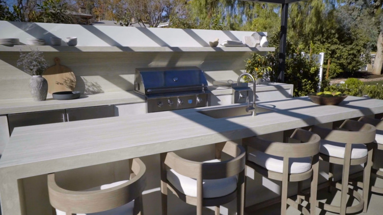 From the outdoor cooking space to the plethora of comfy seating, the design duo prioritized tranquility. This renovation is proof that sometimes simplicity reigns supreme. For example, if you have a hot tub that is hardly used, go ahead and replace it with something more modest and practical, like an outdoor dining area or movie-watching space. For outdoor sofas that resemble the pieces Drew and Jonathan chose, check out the Andorra outdoor sofa from Crate & Barrel. Complement this piece with textured ottomans or stools, like these braided outdoor poufs from Rugs USA.