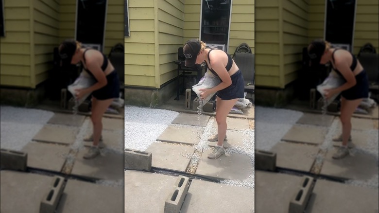 The video then shows adding new gravel to serve as the base for the extended patio area. Before putting down the new gravel, the video shows the homeowner rolling out landscaping fabric to block the growth of any new weeds. With the fabric in place, the homeowner then spreads the new bags of gravel over the top. The video shows people pouring gravel between the sections of the existing pavers, which they did not move. By adding gravel in the existing section, it connects the new section to the existing one from a design standpoint, while also blocking weeds from growing between the existing pavers. The homeowners then bring in some existing furniture and place it over the new gravel section.