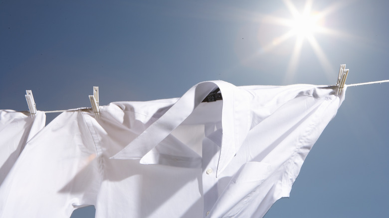 Though it's highly effective, there are some things you should never use bleach for — not least of all because it's highly corrosive and releases chloroform, a known carcinogen, into the air when mixed with water. This fact alone is enough to convince many to stop using bleach in their homes immediately. On the other hand, bleach is very inexpensive compared to other fixes. If you're comfortable giving chlorine bleach a try on your white laundry, simply add about a cup of bleach to each load of laundry along with your regular detergent. Be sure to check each garment's label first to make sure the fabric is bleach-safe. Otherwise, chlorine bleach can make yellowing worse. It can also disintegrate delicate fabrics like silk or wool.