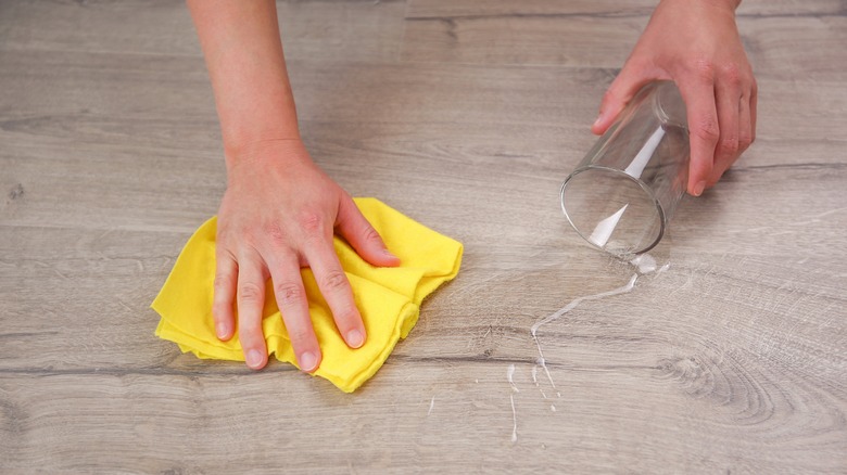 Through an errant elbow knocking over a bottle of olive oil, or slippery fingers losing their grip on a glass of water, you've ended up with a spill on your beautiful hardwood floors. Once you've shooed away pets and cleaned up any glass, you might be fretting over the possibility of a stain. Even if you've only just noticed an old stain, don't despair, because there's an easy fix — one you might already have in your garage.