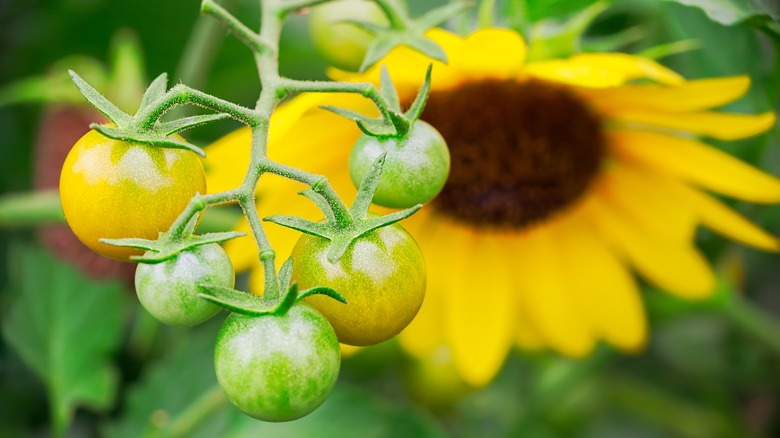 According to data from the Southern Sustainable Agriculture Research and Education, setting up a perimeter of sunflowers can reduce the leaf-footed bugs by 78% to 90% when compared to tomatoes grown without the companion plant. It is the peredovik variety of sunflowers in particular that research suggests has this pest control power. These flowers can also be a trap crop for stink bugs and aphids, keeping these critters away from your tomatoes as well. Apart from the bugs sunflowers draw away from this fruit, the flower's nectar also attracts helpful flyers like bees, which can help pollinate the tomato plant, and hummingbirds, which feast on pests like whiteflies.