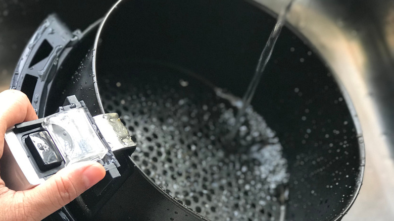 After you've finished using your air dryer, let it cool down for 30 minutes or so. Once the product has lost most of its heat, remove the frying basket and drawer before using a sponge and some dish soap to give each compartment a good wash. Once everything is dry, some experts recommend plugging the air fryer back in and turning it on with no food inside — this will help air out any lingering plastic smell. You may want to avoid conducting this step inside your home, taking it outside or in the garage instead.