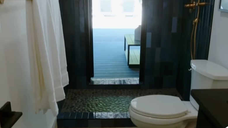 Pepe grew up in Peru, and Jenny Marrs wanted to incorporate his home country into the design of their new house. After fixing the layout, the crew constructed a new vanity with a captivating star pattern tile wall that matched the floors. Rich gray cabinets filled the lower half topped with a lighter-toned counter. In place of the old tub, they built a marvelous walk-in shower with an arched entryway that mirrors the dome shapes seen in many Peruvian buildings. Marble hexagonal tiles covered its interior walls while pebble stones served as flooring. "It's so pulled together like a gorgeous outfit for date night!" described fan Mona Maiso on Instagram.