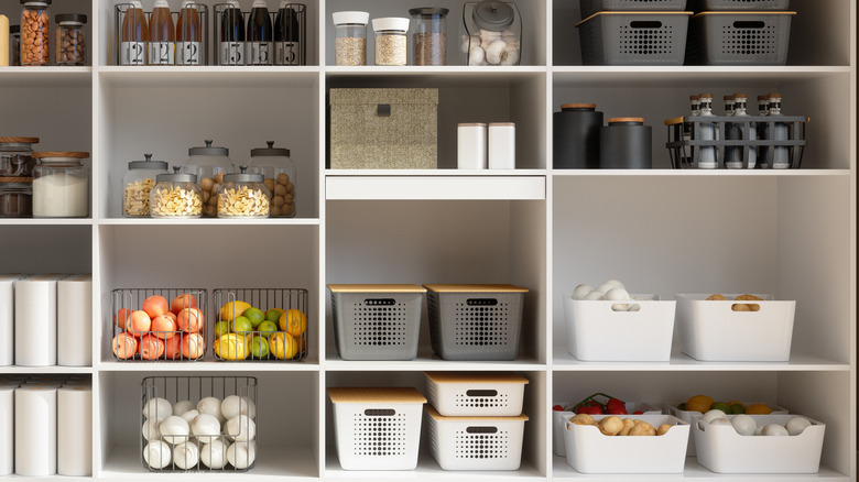 As recommended by Laurie March of "The House Counselor," placing a ventilated basket inside of a cabinet, drawer, or pantry can be just as effective for storing your fruits and vegetables as the countertop. "Since not all veggies need to be refrigerated," March says on HGTV, hidden ventilated baskets "keep produce out of sight, but still fresh, by being conveniently placed in a cool, dry part of the kitchen." Large bunches of bananas or bulky bags of potatoes can be hidden with this hack, providing a sleeker look while saving countertop real estate.