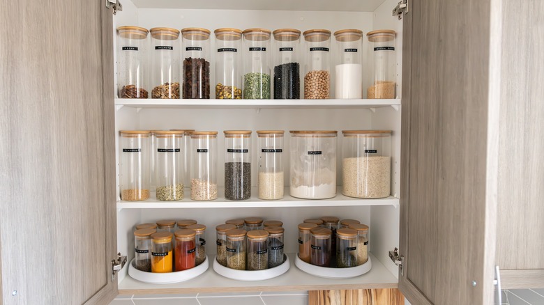 This useful hack works quite well for spices, but it can also be used for other cylindrical items in your pantry, like soup or vegetable cans. Plus, if you're renting your space and plan to move, adjustable tension rods allow you to accommodate cabinets of nearly any size. The same logic applies to the size of the cylindrical containers you're storing: since tension rods are adjustable, not all stored canisters have to consistently be the same size.