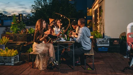 To craft this brilliant way to provide lighting along your patio, you need bulbs with hooks. Look for 250- to 400-lumen LED bulbs; they're bright enough to see your food without glaring in your eyes. Consider, too, the color temperature. Since cozy intimacy is the vibe, choose warm color temperatures: 2,000K to 3,000K. LED lighting is also the most energy-efficient option. Amazon sells a six-pack of glittery and waterproof solar bulbs for under $25. Get two bulbs with a separate rather than built-in solar panel for just over $20 from Walmart. You'll need to take them down and charge them from time to time. With solar-powered bulbs, there's no need to pay an electrician. In fact, outside of hanging the shade, there are no cords at all.