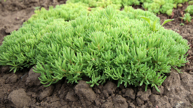 Another logical choice for beautiful plants that prevent pesky weeds in the garden, stonecrop (Sedum) lights up your garden with 1-inch, star-shaped flowers with shades of white, yellow, to pink blooms. They also lure pollinators, ramping up the produce of nearby fruiting plants. But the magic doesn't stop with their looks; those evergreen leaves grow densely and low, keeping out unwanted weed guests by hogging all the sunlight and space. Stonecrop is happy in USDA zones 3 through 9 and slightly alkaline soil and can handle drought. Just make sure you don't leave it sitting in poorly drained or waterlogged soil.