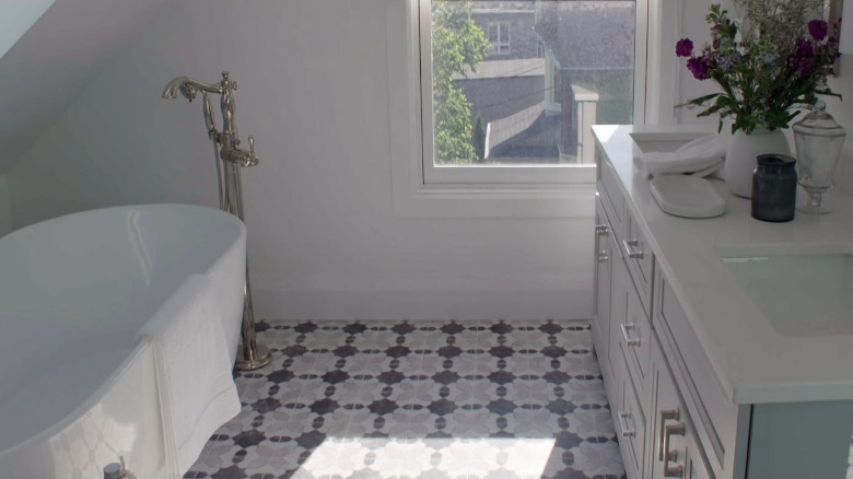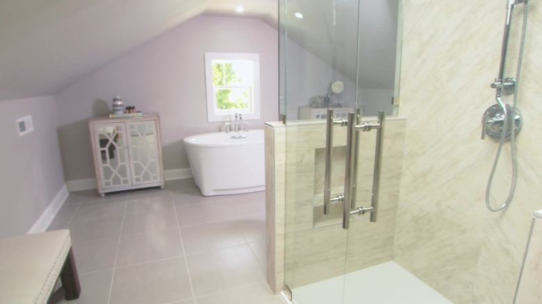 In Season 12, Episode 3, Emilee and Jody chose to purchase a major fixer-upper, due to Jody's job in the construction industry. However, her other jobs prevented her from focusing on her own home, leaving the couple to live in a constant work-in-progress. The master bathroom was nonexistent, but Hilary Farr saw the potential in an unused attic space with vaulted ceilings. Creating a bathroom from scratch is no small feat, but Farr was up to the challenge with an $85,000 budget.