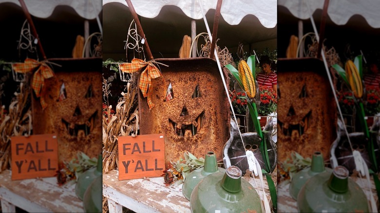If you're on the hunt for some cheap and easy Halloween decorations you can DIY, try your hand at making this jack-o-lantern display out of an old wheelbarrow. All you need to do is turn your wheelbarrow on its side and get to work carving a mouth, nose, and set of simple triangular eyes with a power saw. If the metal is rusty, even better — it's already the perfect color for a pumpkin, it's likely a bit flimsy, and the fact that it's a wheelbarrow makes it a thematically-appropriate add on to an existing harvest-themed display.