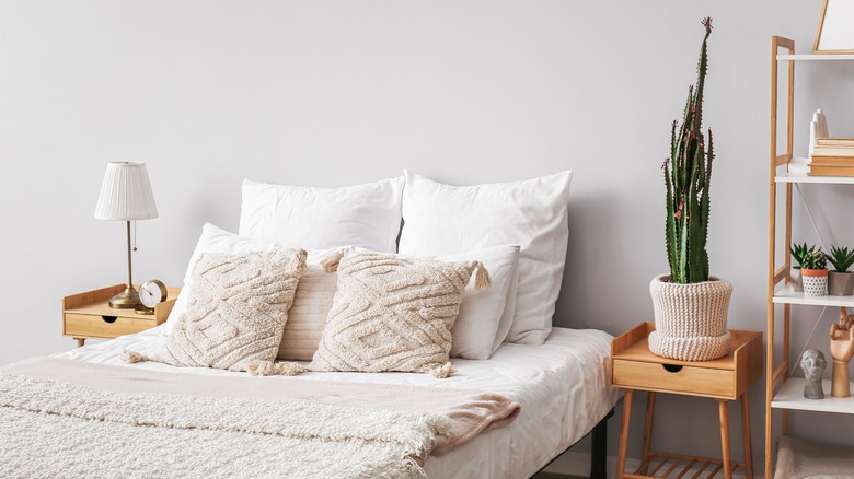 A well-chosen paint color can go a long way too. Marrs pointed out that, "A can of paint is inexpensive. It takes a weekend to paint a room, and it makes a huge impact." There are a few paint colors Jenny Marrs doesn't love in the bedroom, though, especially red. Bold colors and busy patterns can be overwhelming in a small space. Instead, choose neutral shades that evoke a sense of tranquility. Benjamin Moore's most popular neutrals include Wish AF-680, Pashmina AF-100, and Clay Beige OC-11.