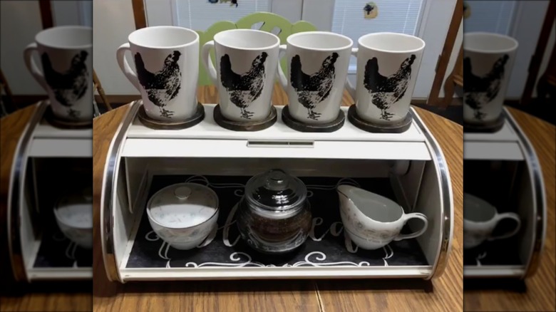 Home coffee bars can elevate your morning routine and help to encourage you to make coffee at home, but many kitchens don't have the room for a full barista-worthy setup. If you find yourself in this situation, consider downsizing the idea rather than abandoning it entirely. Take your old breadbox, then store your favorite coffee mugs on top to ensure they're easily accessible. Fill the box itself with your coffee pods, grounds, and favorite syrups, then place the whole thing next to your coffee pot or espresso machine to help revamp your existing layout.