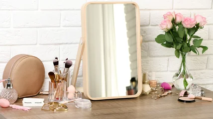 Between all the different lipsticks, concealers, eyeshadow pallets, foundations, and skin care products, it can be difficult to keep your makeup organized and within reach. Luckily, this Dollar Tree hack will help you DIY a showstopping, affordable vanity mirror that also has storage shelves attached on the sides. This makeup storage solution will help you get ready with ease, keep your beauty supplies neat and organized, and make your space look gorgeous. With a foam board, square shadow box frames or kid's money boxes, some adhesive lights, several small mirrors, and a few packs of adhesive diamond wrap, you can craft a stylish vanity that can be placed wherever you need it. Since the shelves, mirror, and lights will all be connected to the foam board, this vanity could be set on your bathroom counter and then later moved to your bedroom if desired.