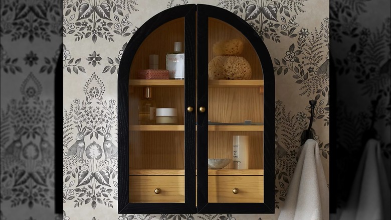 Who says your bathroom linen chest needs to be boring or strictly utilitarian? Class up any bath with an incredible arched linen cabinet for storing extra towels and sheets. The House of Hackney curio cabinet from Anthropologie offers maximum elegance with a glass door showing off its wallpaper interior. Drawers will help stash extra bathroom products out of sight but within easy reach. Nothing screams luxury more than a jaw-dropping curved cabinet unexpectedly showcased in a bathroom for additional storage.