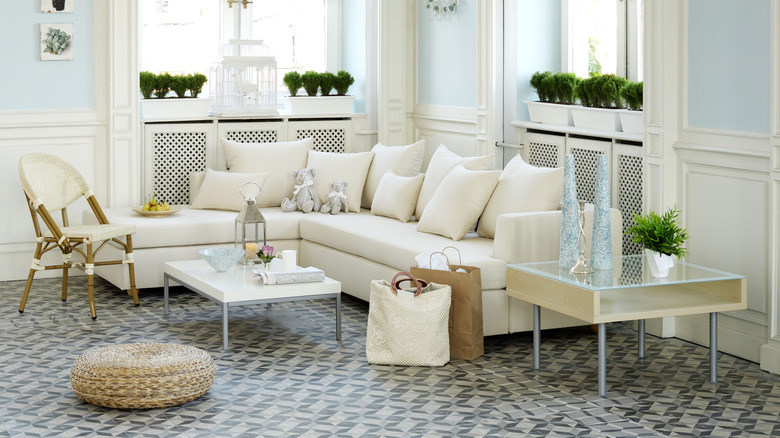 Next, try solid-colored furnishings, like a simple plush white sofa to offset the busyness of your patterned floor. You may also take your wall adornments into consideration: think about leaving big windows without curtains, to draw light in and make the space look big and bright. If you do decide to use curtains, opt to decorate with a neutral-colored sheer panel that will blend in while still blocking some sun. Take your time, get creative, and don't forget to experiment and have fun with your new funky flooring.