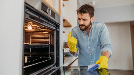 While ammonia can tackle surface messes, it's another harsh chemical best kept away from food preparation areas. Never use bleach and ammonia together, as mixing these chemicals creates toxic gasses called chloramines. Like bleach, ammonia is corrosive and can cause respiratory issues if inhaled. Even commercial oven cleaners that contain ammonia and other harsh chemicals. These products are usually caustic, meaning they can eat away at the skin, eyes, and lining of the nose, throat, mouth, and lungs. Inhaling the fumes from these products can cause respiratory issues, and using them to clean your oven may leave chemical residue inside that can contaminate your food. You shouldn't need protective gloves and eyewear to clean your oven! Fortunately, there are methods to de-gunk the appliance without harsh chemicals.