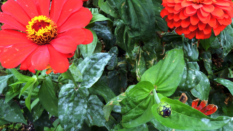 Have you ever seen those gorgeous gardens that look like they're ready to explode with flowers of every kind? While that might be something Insta-worthy, it can be a big problem for zinnias. If your flowers start to look like they've got a white, powdery substance on their leaves, then it's a sign they've contracted powdery mildew from a neighbor when they should've been given a little space. Highly pernicious, powdery mildew is the most prevalent disease these show-stopping annuals contract, and it can cover entire areas of the leaves, preventing the plant from being able to produce chlorophyll and keep its leaves and flowers healthy.