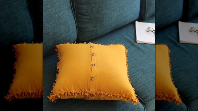 Throw pillows are great to dress up your interiors, but over time, you might find that the pieces you once loved no longer align with your style. Instead of tossing them out and buying brand-new pillows, consider giving them an upgrade with a new cover. To create your own pillowcase out of an old piece of clothing, all you have to do is cut out two squares of fabric that are both a bit larger than your pillow. Cut fringe along the edges, place the pillow between the pieces of fabric, and tie the fringe together.