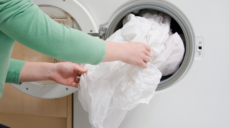 Next, you can use the baking soda hack that will transform scratchy sheets into silky luxury. Adding it in with your detergent super-charges the soap, giving it a boost to help lift away oil and dirt. This will leave your sheets feeling cleaner and fresher, making them seem softer. Baking soda also breaks down the minerals in hard water that can make fabric feel stiff or rough. This creates softer water, which also makes softer sheets. Lastly, use vinegar in the rinse cycle in place of softener. The acetic acid in vinegar will break down any lingering detergent residue that the rinse cycle didn't get, leaving your sheets softer to the touch.