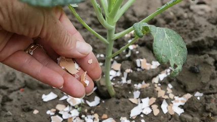 One of the best ways to use crushed eggshells in your garden is as a deterrent against slugs and snails as they won't like crawling over the shells due to the sharp edges. All you have to do is wash the eggshells and let them dry. This allows you to break them down more easily and removes any problems with bacterial growth. Then, just crush them up coarsely in any way that you find the easiest. You could put them in a plastic bag and use a heavy rolling pin to smash them or utilize a mortar and pestle to crush them up.