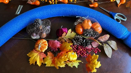 I don't have a designated craft room in my home, so I cleared the dining room table and got to work. I began by plucking apart the foliage bouquets and separating accent pieces into piles of pumpkins, pinecones, and leaves. I left the glitter garlands intact. Next, I used scissors to snip the floral wire into 2-inch segments and folded each in half. You'll need almost as many of these as you have decorative accessories. Finally, I was ready to start this pool noodle DIY to create the most beautiful fall foliage display my budget allowed for.