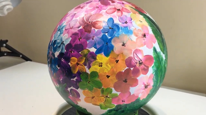 Sand, clean, and prime your bowling ball, and let it become a new canvas. Paint whatever you would like. Flowers are always a good inspiration, or you can create a seasonal item like a faux snow globe or jack-o-lantern. When you are done, let the paint dry completely. Then, if you plan to put your bowling ball outside, make sure that you add a clear protective coat so that your new artwork doesn't get ruined by the elements. Place it on the ground or use one of the finger holes and attach a rod with some caulk to create a stand.