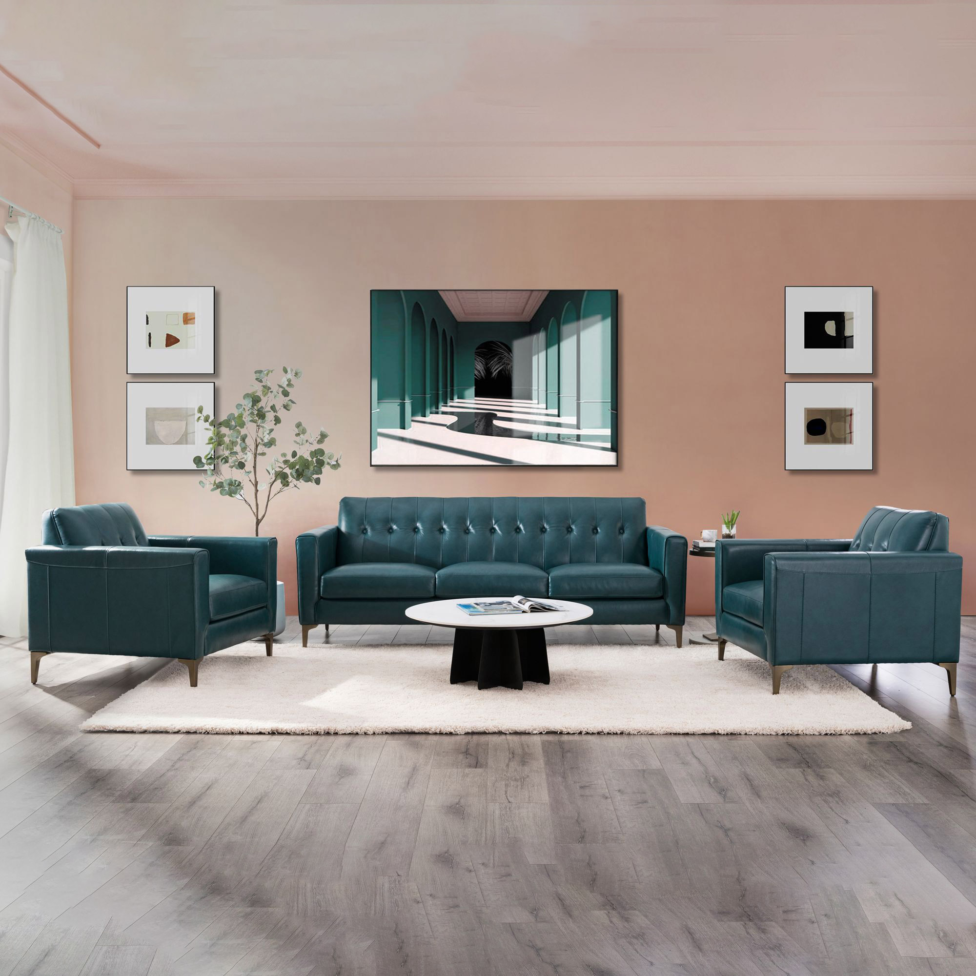 The three-piece Toulouse sofa set from Costco ($4,599.99) could be an ideal option if you want to create a mid-century modern home and love the longevity of leather. This set includes one three-cushion sofa and two armchairs with tufted backs and firm genuine leather seats. The rear side of the pieces are covered in leather splits (split leather that has probably received a polyurethane or PVC coating), but one reviewer notes these are such a great color match, that they're almost indistinguishable from the fronts. Speaking of color, the couch set comes in a rich teal tone, but deep navy blue is also an option for those who prefer a darker look. The tapered metal legs complete the slightly retro look with a brassy matte finish. While tailor-made to fit a mid-century modern aesthetic, these pieces wouldn't look out of place in transitional living rooms or even an eclectic space.
