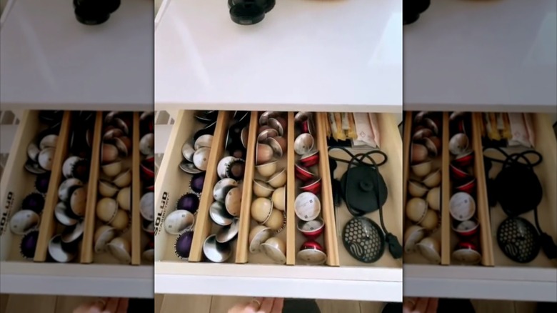 While Keurig coffee makers and similar machines are extremely convenient, especially when you need that first cup of joe in the morning, the pods can quickly overtake your kitchen. Luckily, you can keep Keurig coffee pods from cluttering your countertops with one simple solution — a cutlery divider. Though these trays typically sit in drawers and keep your forks, spoons, and knives separated, you can easily use one to hold your coffee pods and keep them neat. With this system, you can see all the drink options you have at a glance and quickly choose one to pop into your machine. Additionally, you'll be able to arrange your pods by type, brand, or strength within the different compartments.