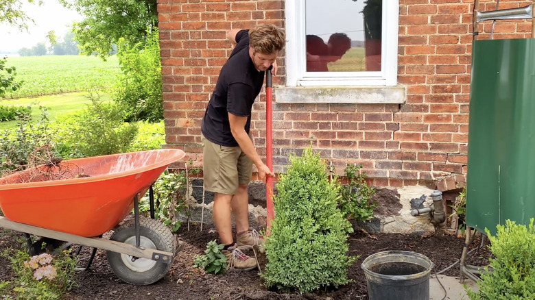 Some boxwood cultivars reach 20 feet tall if left to their own devices — here's looking at you, common boxwood (Buxus sempervirens) and you, English boxwood (Buxus sempervirens 'Suffruticosa'). Planting them in a row along your fence line and letting them thrive means you'll have a towering stand of scrubby shrubs in no time. That'll block any nosy neighbors' line of sight into your backyard for sure! You'll still need to tame your overgrown shrubs occasionally for their health and your safety, but sculpting-level pruning skills won't be necessary.