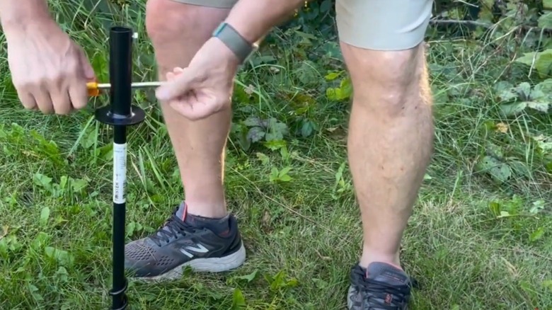 When it's time to place the metal pole in the ground, the deeper the post goes into the ground, the sturdier it will be. Some metal poles use a base that has four or five prongs that go into the ground, providing stability by using multiple buried legs. You also can purchase a twist design, where the base of the pole has threads that you can screw into the ground. As you're driving the prongs or screwing the base into the ground, use a level to ensure the main section will be straight when you attach it.
