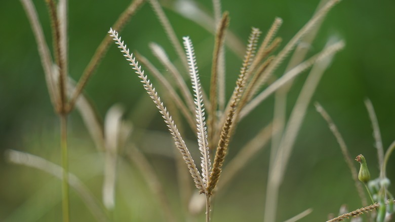Crabgrass' most prominent characteristics are its round stem, textured blades, and a vibrant green color. Large crabgrass has hairy leaves, whereas the smooth variety is — as its name suggests — smooth. Regardless of the variety, crabgrass usually has between two and six racemes, or seed heads, growing from its stem, and the plant likes to spread along the ground. Goosegrass spreads in much the same way, but it has three distinguishing features that set it apart from crabgrass. For one, goosegrass clumps appear much flatter. Secondly, the branches are meatier than those of crabgrass, and the seed heads have a distinct, fishbone pattern. Finally, there's the color. Goosegrass is known as "silver crabgrass," and the moniker stems from the plant's pale-green leaf blades.