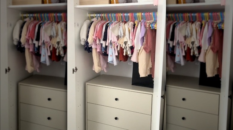 Hang a fabric shelf from the closet pole to store delicate, lightweight items like scarves, intimates, and leggings. Dollar Tree's Essentials Three Shelf Collapsible Fabric Closet Storage is sold at a price that honestly can't be beat. Or, go fancy with the Pipishell Hanging Closet Organizer — three of the six shelves have removable drawers! To be fair, this idea will work in just about any tall wardrobe that features a closet pole, but it's a simple organizational transformation that pairs perfectly with the BRIMNES closets.