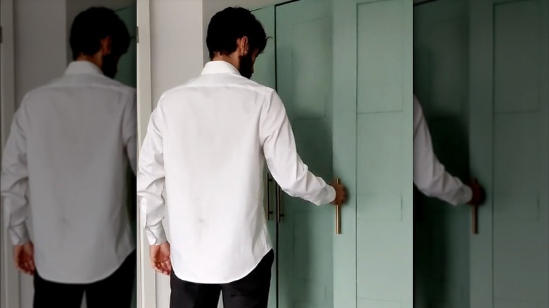We talked already about painting or wallpapering your BRIMNES closet, but this idea takes DIY decor a step further. You're going to replace the door panels with something more practical than plain ol' wood. Cork board is a great option: It's cheap, easy to cut to size, and you can use it — along with thumb tacks — to display to-do lists, affirmations, or your necklace collection. Cane panels turn the closet mid-century modern and keep air circulating in a cramped space. Plus, they add functionality, since you can hang accessories — think hook earrings — from them.