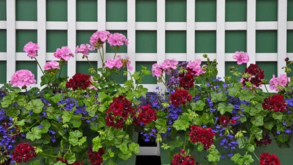 Do you love spending time on your patio but wish you had a bit more privacy? Try planting ivy geranium (Pelargonium peltatum) to create a vibrant, living screen that will last all summer long. This colorful perennial has thick, ivy-like leaves and features clusters of flowers that range from bright white to saturated red. Its stems often reach three feet across, making it ideal for enhancing a trellis or wall. If you don't already have a structure in place, it's easy to DIY a wooden trellis.