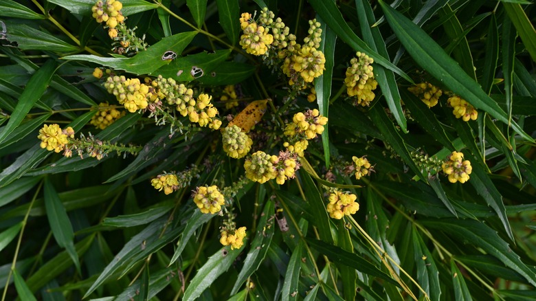 Fortune's mahonia (Berberis fortunei) is a non-invasive Chinese import that's become popular with hummingbirds, bees, and butterflies for its perfumed yellow blooms and reddish-purple berries that appear from summer-end through early winter. However, as the slow-growing perennial matures to around 3 to 5 feet wide mound, it behooves itself as a security hedge in zones 7 to 9. Plonk it in a sheltered position (away from winds), though. Fortune's mahonia burgeons numerous spines (much like a holly tree) on its evergreen, fern-like foliage, adding major deterrence value. It's a shade-lover, tolerating everything from dappled to heavy shadows.